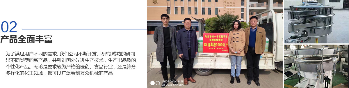 新鄉市萬眾機械設備有限公司是生產振動機械、篩分設備和過濾設備的專業廠家之一,擁有生產設備、雄厚的技術力量、完善的檢測手段、嚴格的管理體系。是河南省的商標之一,被河南省科學技術廳頒定為高新技術企業,為新鄉市“守合同重信用企業“。質量信得過產品、質量服務消費者滿意企業、合格產品等榮譽稱號。擁有自主進出口經營權,產品遍布各地,并遠銷北美、西歐及東南亞等地區。